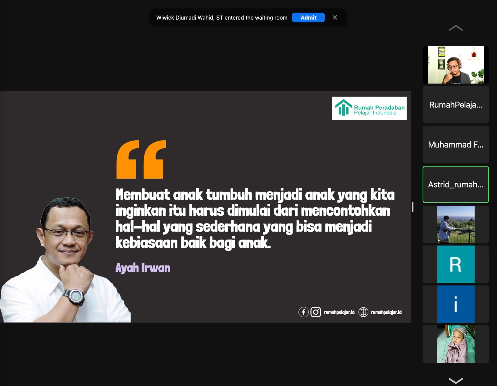 Orang tua layaknya menjadi rumah teraman dan ternyaman bagi anak-anak nya. Namun, tidak semua orang Allah takdirkan terlahir dari orang tua yang penuh cinta, terkadang ada jejak luka pengasuhan yang mereka torehkan pada anak tanpa disadari terbawa hingga anaknya dewasa. Rumah Peradaban Pelajar Indonesia berkolaborasi dengan LBF (Lumigar Bogor Family)-@lumigarbogorfamily , komunitas Cacabun @komunitascacabun , dan Parenting Bogor @parenting.bogor mengundang para orang tua untuk menimba ilmu lebih dalam dari ahlinya agar bisa bangkit menjadi orang tua yang hebat dan kompak bagi ananda tercinta. Kegiatan ini dilaksanakan pada Sabtu, 1 April 2023 secara daring via Zoom Meeting. Narasumber pada kegiatan ini yaitu, Bunda Elly Risman, dan Ayah Irwan. Pada Sesi 1 Bunda Elly Risman membawa materi dengan tema Berdamai Dengan Inner Child pada pukul 09.00-12.00 WIB. Sesi 2, terselenggara pada pukul 13.00-16.00 dengan narasumber Ayah Irwan (Pakar Parenting Islami) menyajikan materi Ayah Bunda Kompak Asuh Ananda.
