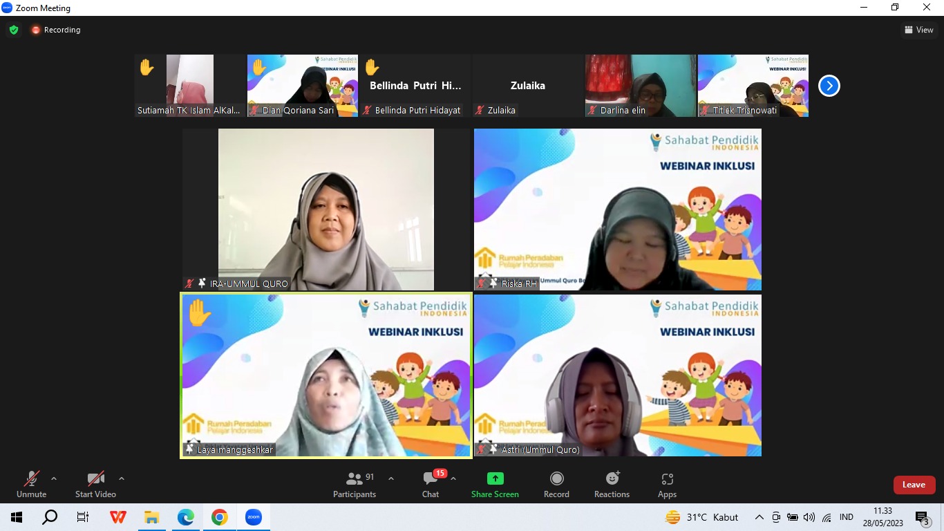 Sekolah Pendidik Indonesia mengadakan Webinar Sekolah Inklusi secara daring. Webinar khusus bagi tenaga pendidik di sekolah inklusi ini diselenggarakan dengan mengundang narasumber dari salah satu sekolah dan kemendikbud. Acara ini bertujuan untuk memberikan pemahaman bagi tenaga pendidik di sekolah inklusi dalam menangani peserta didik berkebutuhan khusus. Acara ini diisi oleh dua narasumber yang membawakan materi berbeda. Materi pertama mengenai Deteksi awal dan mengenal lebih dalam Peserta Didik Berkebutuhan Khusus yang diisi oleh Riska Rohmanti, S.Psi (Guru BK Ummul Quro Bogor). Materi kedua mengenai Layanan Inklusi untuk Peserta Didik Berkebutuhan Khusus oleh Astri Widiastuti, S.Pd (GP Angkatan 4 kemendikbud, GPK Angkatan 1 GTK Kemendiksus). Kegiatan ini terselenggara dalam program Gen Berkah atas kerja sama antara RPPI dan LAZ Al Bunyan.